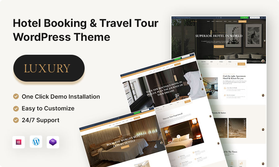 Luxury Hotel – Hotel Booking WordPress Theme is a refined, premium‑looking WordPress theme designed for upscale hotels, resorts, and vacation rentals. With its elegant design and responsive layout, it ensures your site looks luxurious and functions smoothly on any device. Guests can browse rooms, check availability, and book stays with ease.